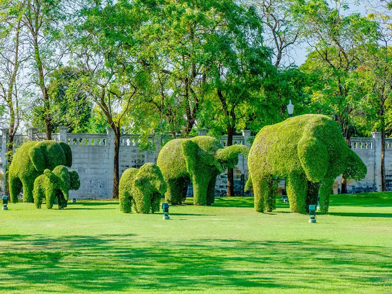 The gardens are a verdant paradise, meticulously designed to reflect the elegance and harmony that characterized the Thai royal court. As you wander through the lush foliage, the air is filled with the sweet scent of blossoming flowers and the gentle rustle of leaves swaying in the breeze. The lawns, emerald green and perfectly manicured, stretch out like plush carpets, inviting you to take leisurely strolls or simply pause to soak in the tranquility.