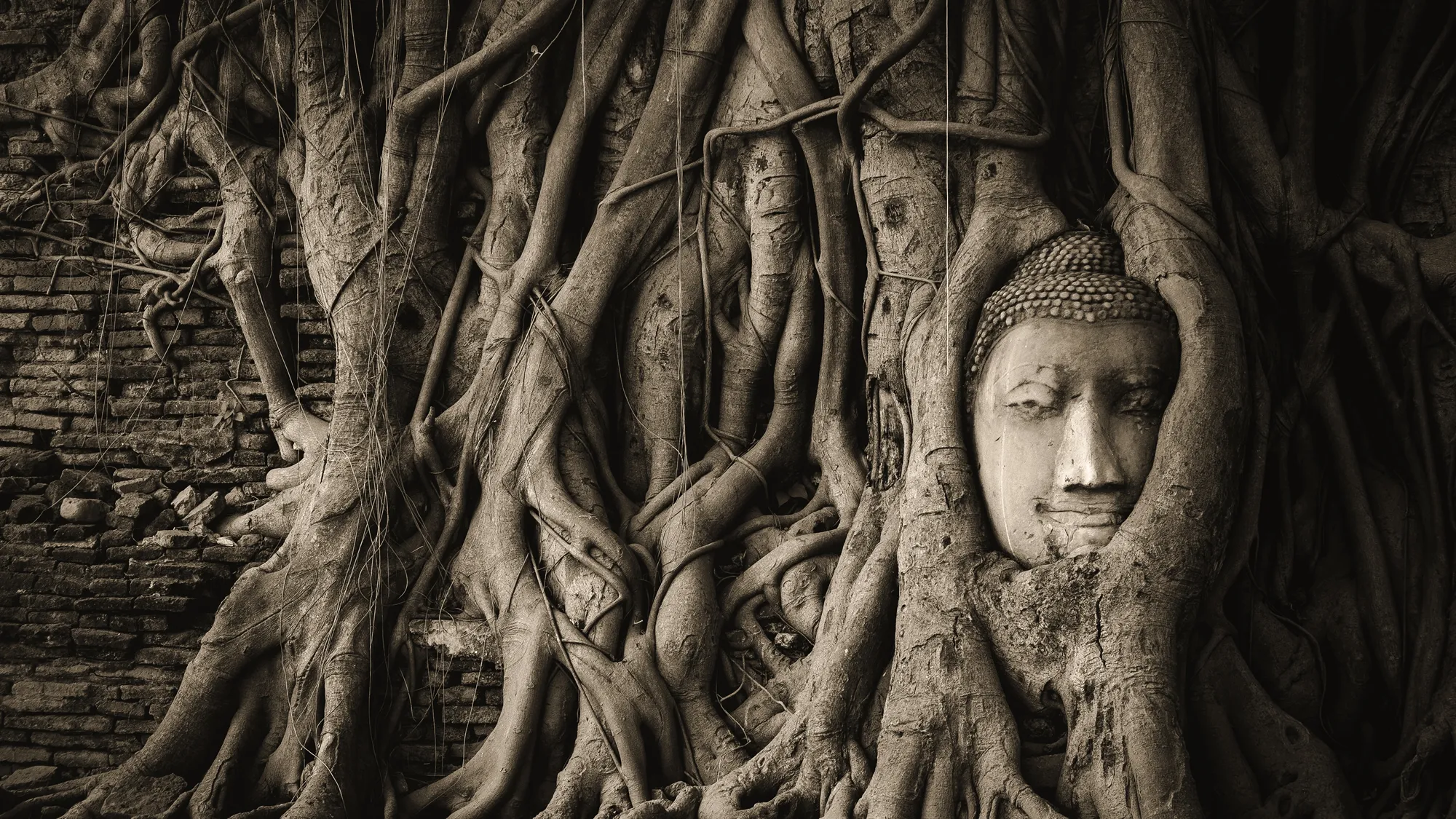 In Buddhist spirituality, the Bodhi tree is a revered symbol, representing the tree under which Siddhartha Gautama attained enlightenment and became the Buddha. Thus, the image of the Buddha head within the roots resonates deeply with themes of enlightenment, resilience, and the eternal cycle of life. It signifies the enduring presence of spirituality amid the impermanence of worldly structures, a core tenet of Buddhist philosophy.