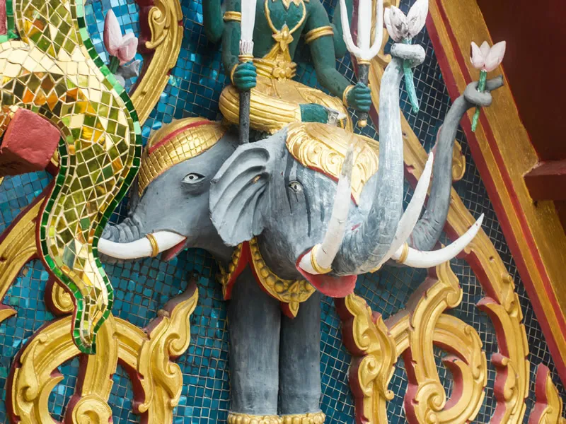 The temple’s architecture is a vivid reflection of Thailand’s rich cultural tapestry, blending animistic beliefs, Brahmin customs, and traditional Buddhist design elements. This fusion is deeply significant, as it mirrors the spiritual diversity that has shaped Thai culture over centuries. Animism, for instance, is evident in the prominence given to offerings and reverence for natural spirits in the temple’s design. Small shrines containing sacred objects, floral garlands, and incense can be spotted throughout the temple grounds, creating a connection between the physical world and spiritual entities.