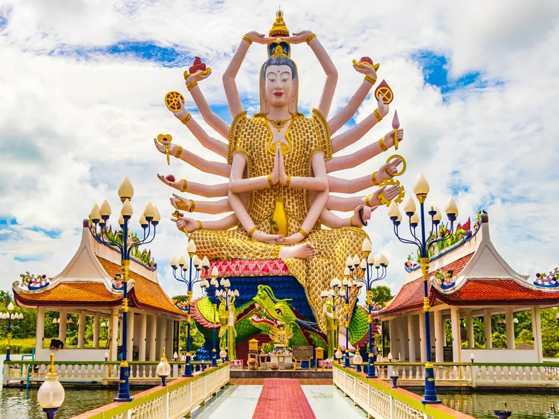 Perhaps the most iconic feature of Wat Plai Laem is the towering white statue of Guanyin, the eighteen-armed Goddess of Compassion and Mercy. Standing gracefully upon the temple lake, she represents unconditional love and serves as a protector for those in need. The vivid colours of her fan-like arms, alongside her serene expression, make this statue both visually striking and spiritually profound.